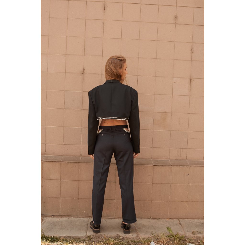 Kalhoty mají na bocích průstřihy zdobené perlami a štrasovou stuhou.