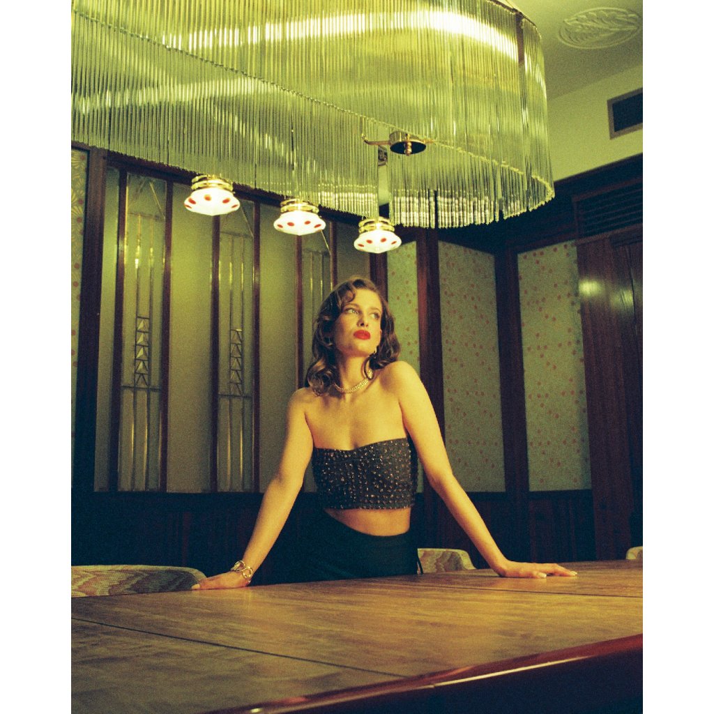 Tento upcyklovaný top, vyrobený ze saka, je posypaný třpytivými dead-stock krystaly Swarovski pro elegantní a luxusní vzhled. Na zádech má jemné šněrování, které umožňuje nastavitelný střih pro velikosti S, M a L. Statement kousek, který spojuje udržitelnost s high-fashion sofistikovaností.