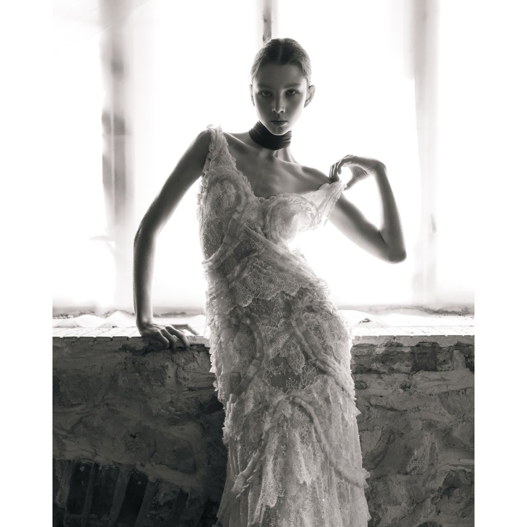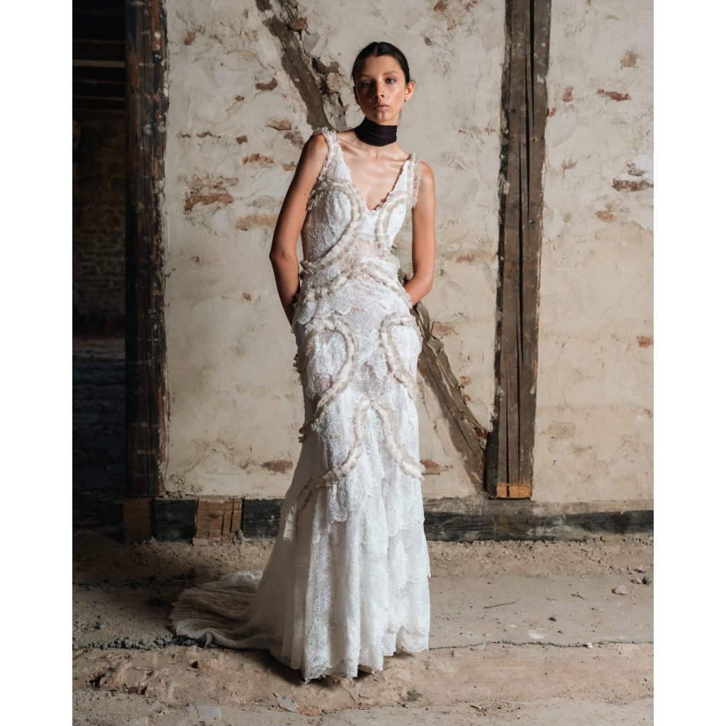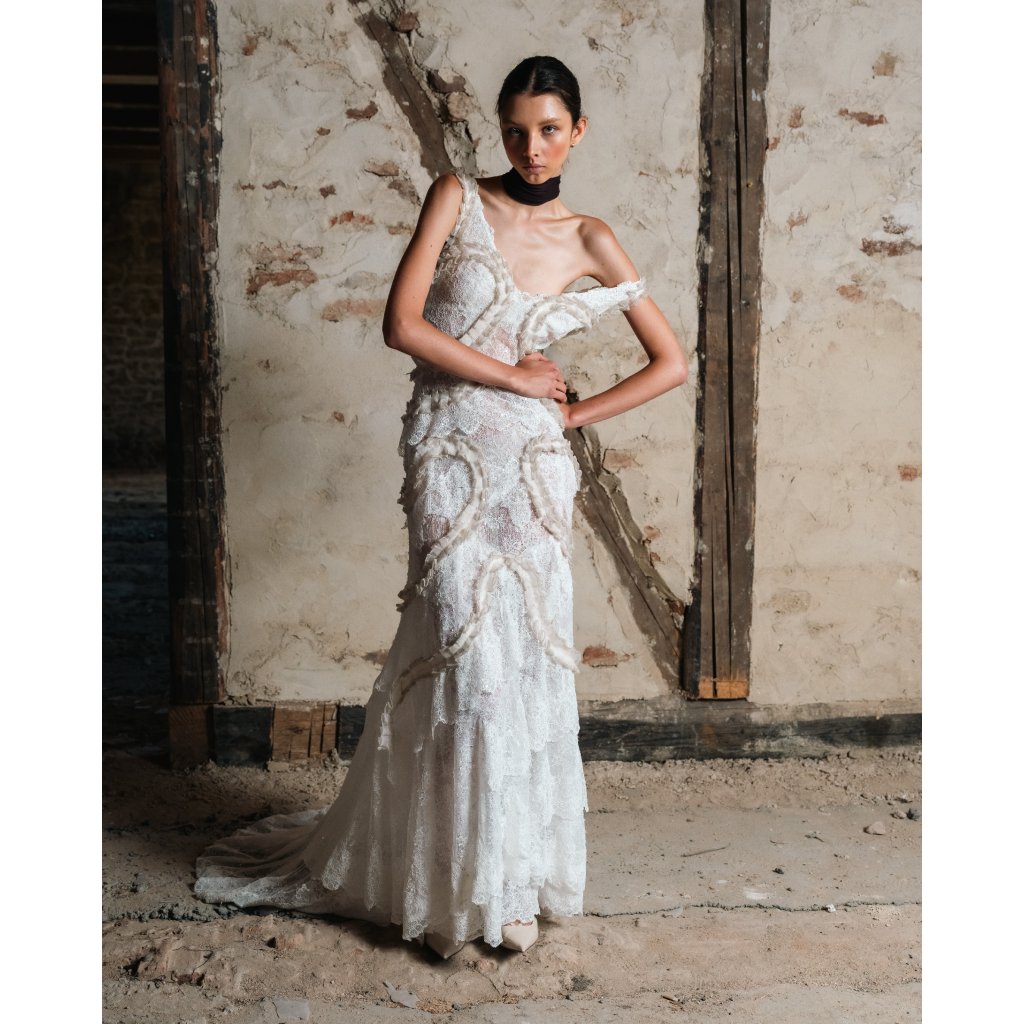 Je vytvořený formou upcyclingu z italské krajky a vintage svatebních šatů. Model je pouze jednoho vydání. Vel S.